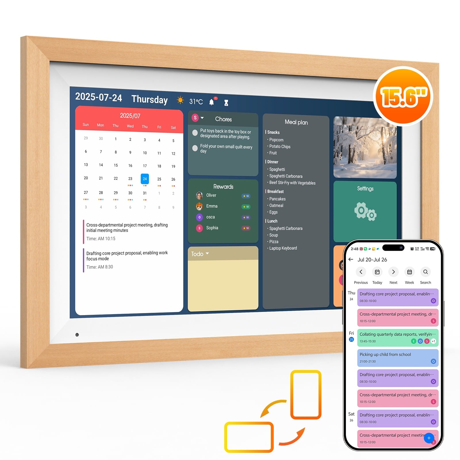 - All-inclusive Digital Calendar for Family Planning - Support wall or tabletop mount, with 15.6-inch big FHD display & APP access, easily assign and track each member their own color and chores. Help the whole family quickly read and track the family's schedule and planning anywhere anytime, expertly arrange chores, make meal planning, and set reminders for to-dos. A game changer for family life organization