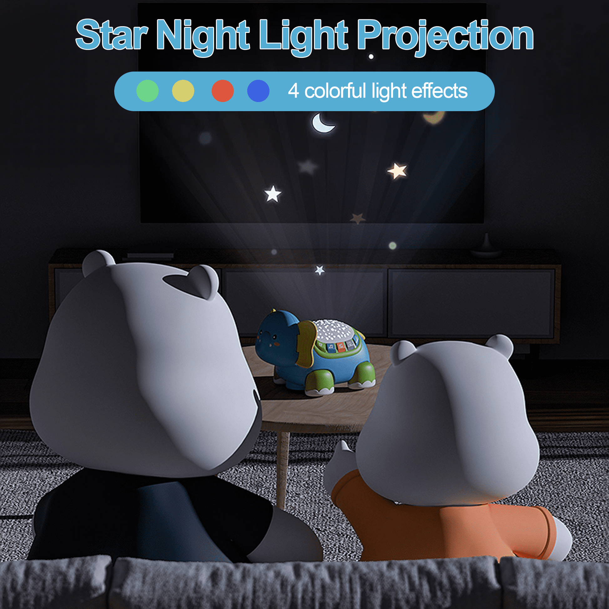 - Star Night Light Projection: This toddler toy projects 4 soft-colored light patterns onto the ceiling, creating a calming visual effect. Babies can easily press the button to change colors for sensory play.