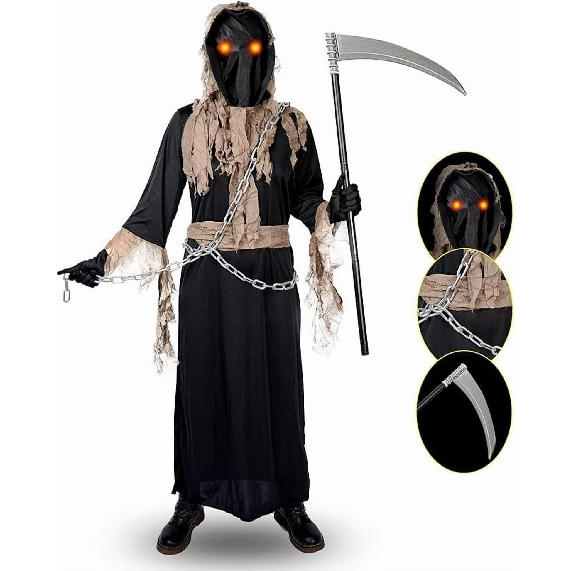 Grim Reaper Costume for Kids,Phantom Halloween Costume with Red Glowing Eyes, Gloves Scythe for 8-10 Years