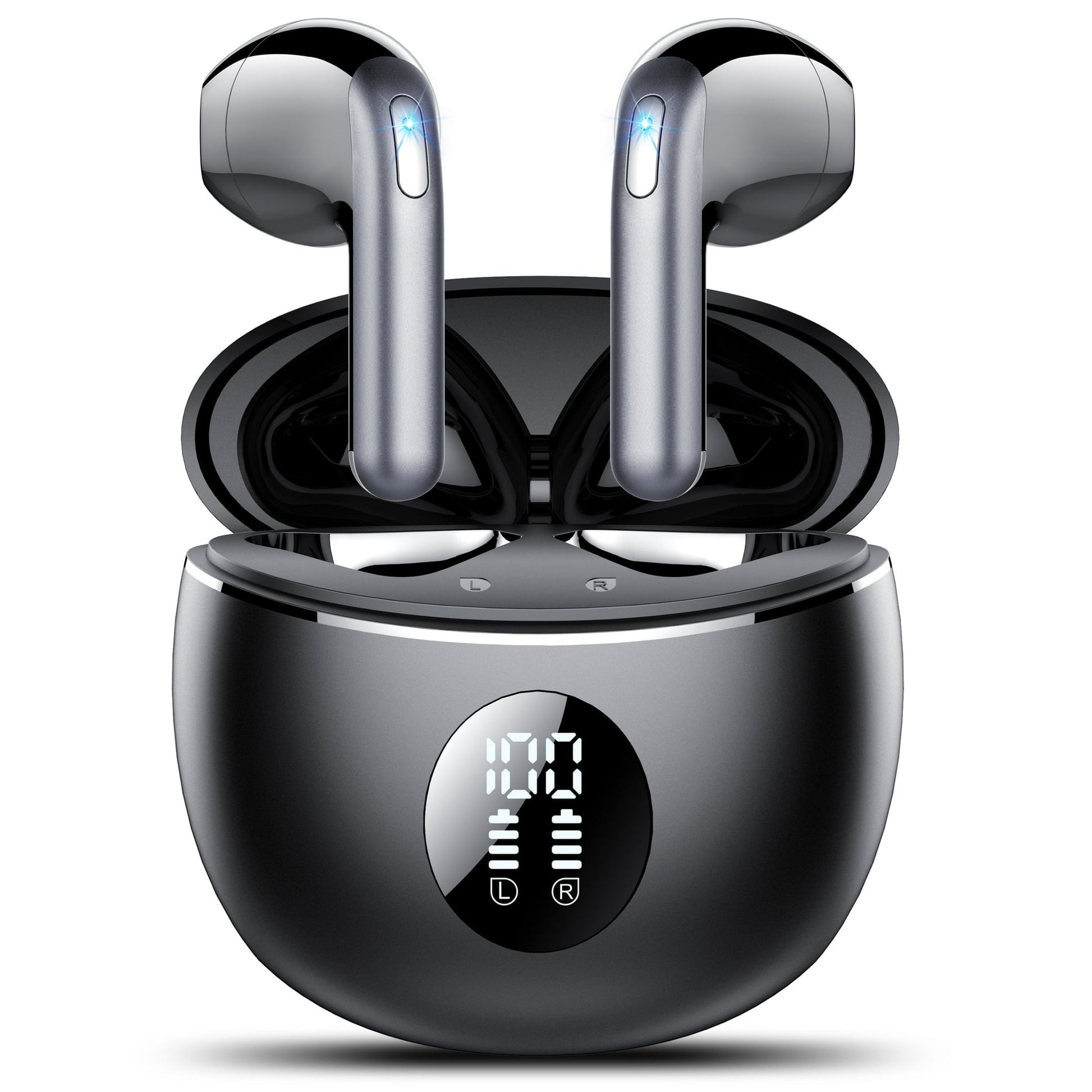 - 【50 Hrs of Playtime & Real-time LED Display】The wireless headphones provide approximately 8 hrs of playtime on a single charge, which can be extended to 50 hrs with the compact charging case. the LED display figures accurately show the remaining power of both the charging case and the earphones.